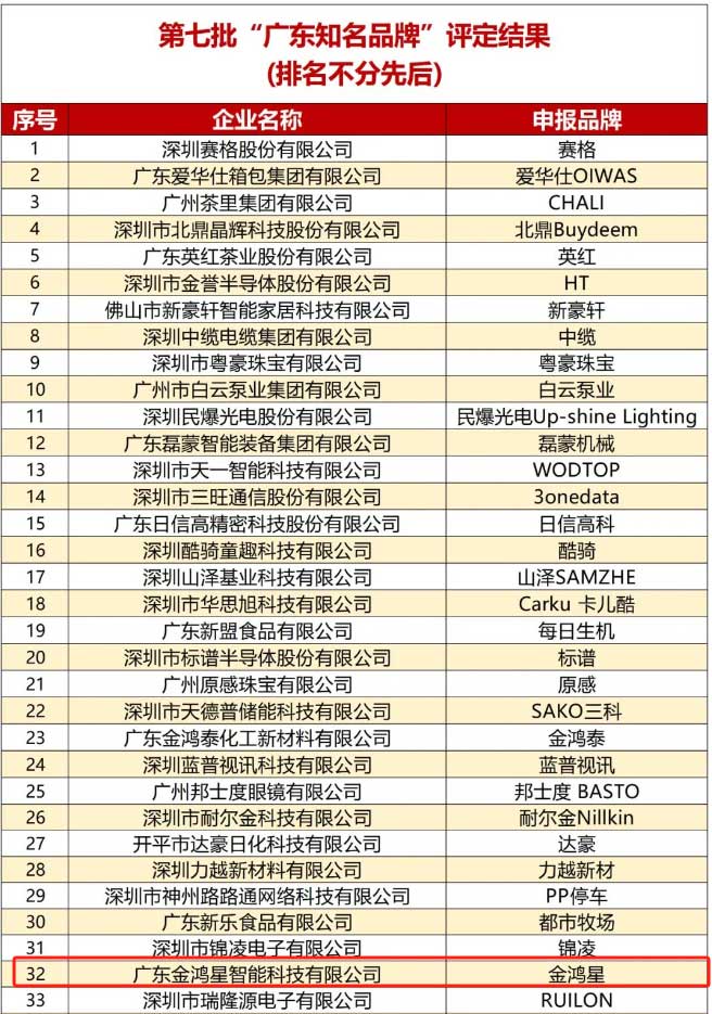 2024年1月1日,第七批“廣東知名品牌”名單公布,廣東金鴻星智能科技有限公司憑借獨(dú)特的品牌理念和強(qiáng)大的企業(yè)實(shí)力與客戶(hù)認(rèn)知度等綜合實(shí)力,獲得了專(zhuān)家評(píng)委與廣大客戶(hù)的高度認(rèn)可,于眾多企業(yè)中脫穎而出,斬獲“廣東知名品牌”殊榮。