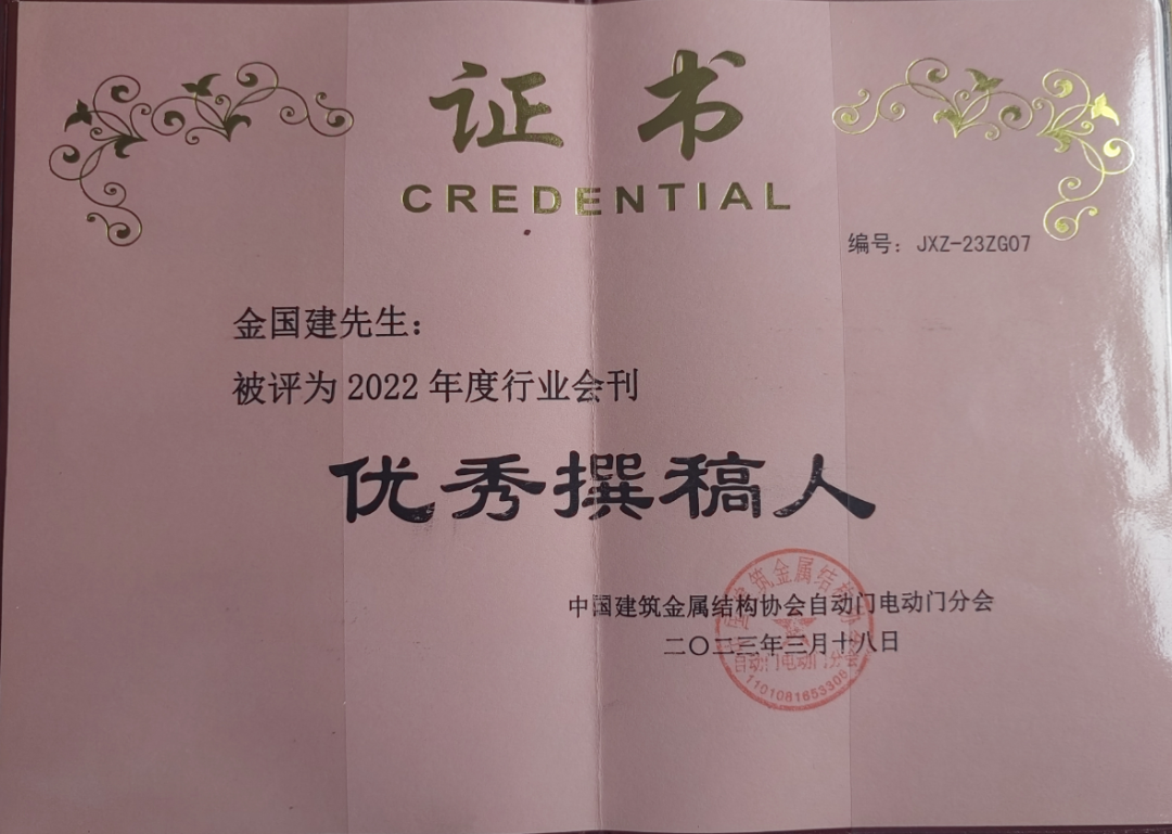 盛典現(xiàn)場(chǎng),廣東金鴻星智能科技有限公司董事長(zhǎng)金國(guó)建先生被聘為中國(guó)建筑金屬結(jié)構(gòu)協(xié)會(huì)技術(shù)顧問(wèn)并斬獲多項(xiàng)殊榮,其中獲評(píng)「2022年度自動(dòng)門電動(dòng)門分會(huì)優(yōu)秀副會(huì)長(zhǎng)」、「戶外人行智能平開(kāi)門參編單位」、「自動(dòng)門電動(dòng)門行業(yè)特別奉獻(xiàn)獎(jiǎng)」,金鴻星董事長(zhǎng)金國(guó)建榮膺「2022年度行業(yè)會(huì)刊優(yōu)秀撰稿人」稱號(hào),這些殊榮充分肯定了金鴻星在中國(guó)自動(dòng)門電動(dòng)門行業(yè)的卓越地位及深厚影響力。