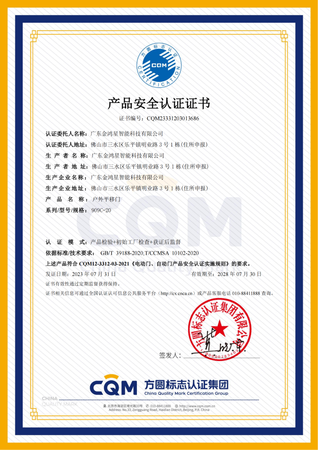 金鴻星產(chǎn)品經(jīng)過一系列嚴(yán)格的審查及評審,順利獲得戶外平移門以及電動伸縮門“產(chǎn)品安全認(rèn)證”證書,不僅彰顯了金鴻星在行業(yè)內(nèi)的地位,更證實(shí)了金鴻星在產(chǎn)品安全上不斷精進(jìn)的實(shí)踐與成果。金鴻星始終以產(chǎn)品安全與智能的發(fā)展為前提,不斷對產(chǎn)品的性能進(jìn)行持續(xù)升級,致力于研發(fā)高品質(zhì)、安全與智能的放心產(chǎn)品,引領(lǐng)行業(yè)高質(zhì)量高標(biāo)準(zhǔn)健康發(fā)展,給每一位選擇金鴻星的客戶都能買的放心,用的安心。